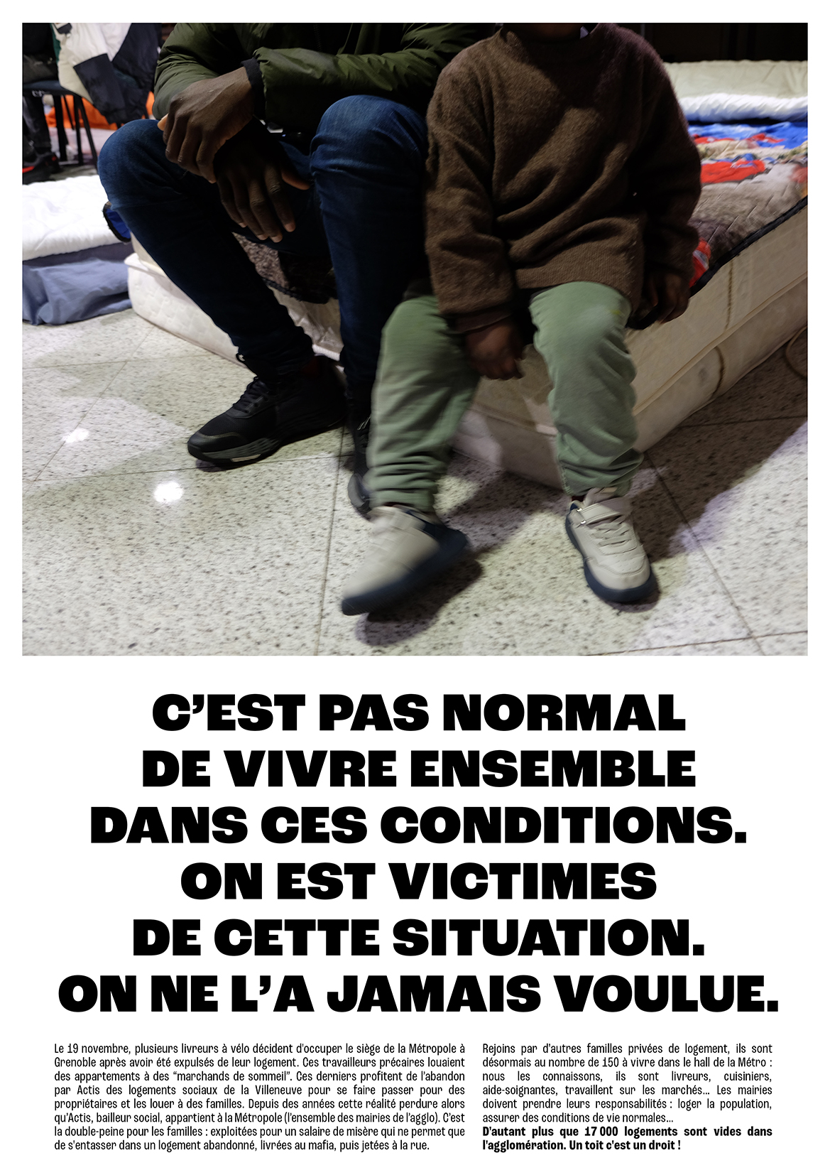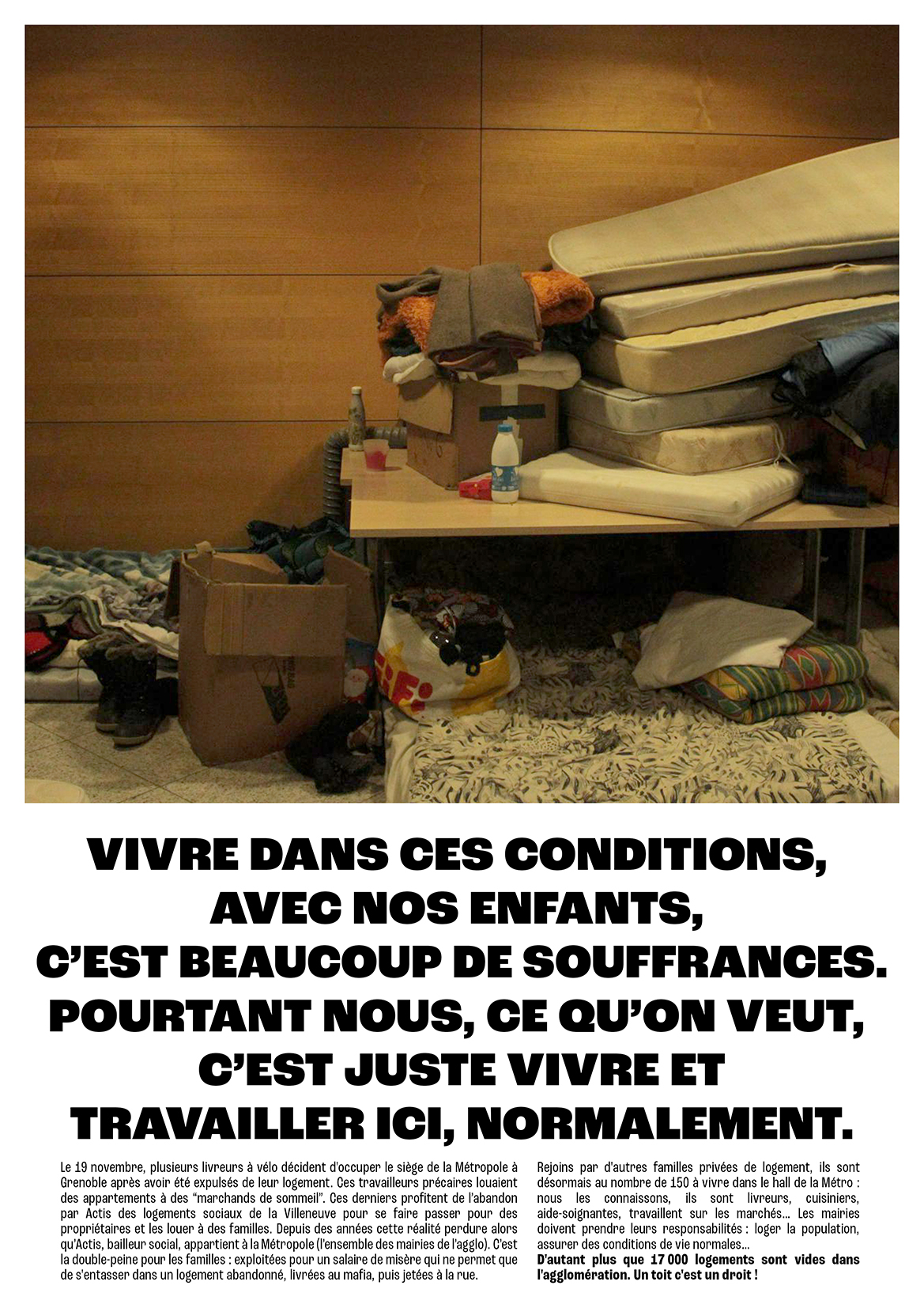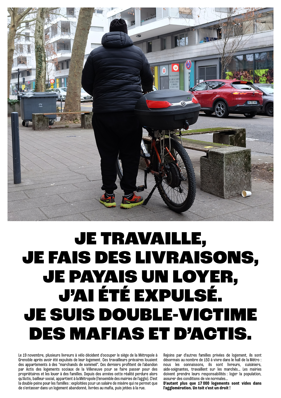 Le 19 novembre, plusieurs livreurs à vélo décident d’occuper le siège de la Métropole à Grenoble après avoir été expulsés de leur logement. Ces travailleurs précaires louaient des appartements à des “marchands de sommeil”. Ces derniers profitent de l’abandon par Actis des logements sociaux de la Villeneuve pour se faire passer pour des propriétaires et les louer à des familles.