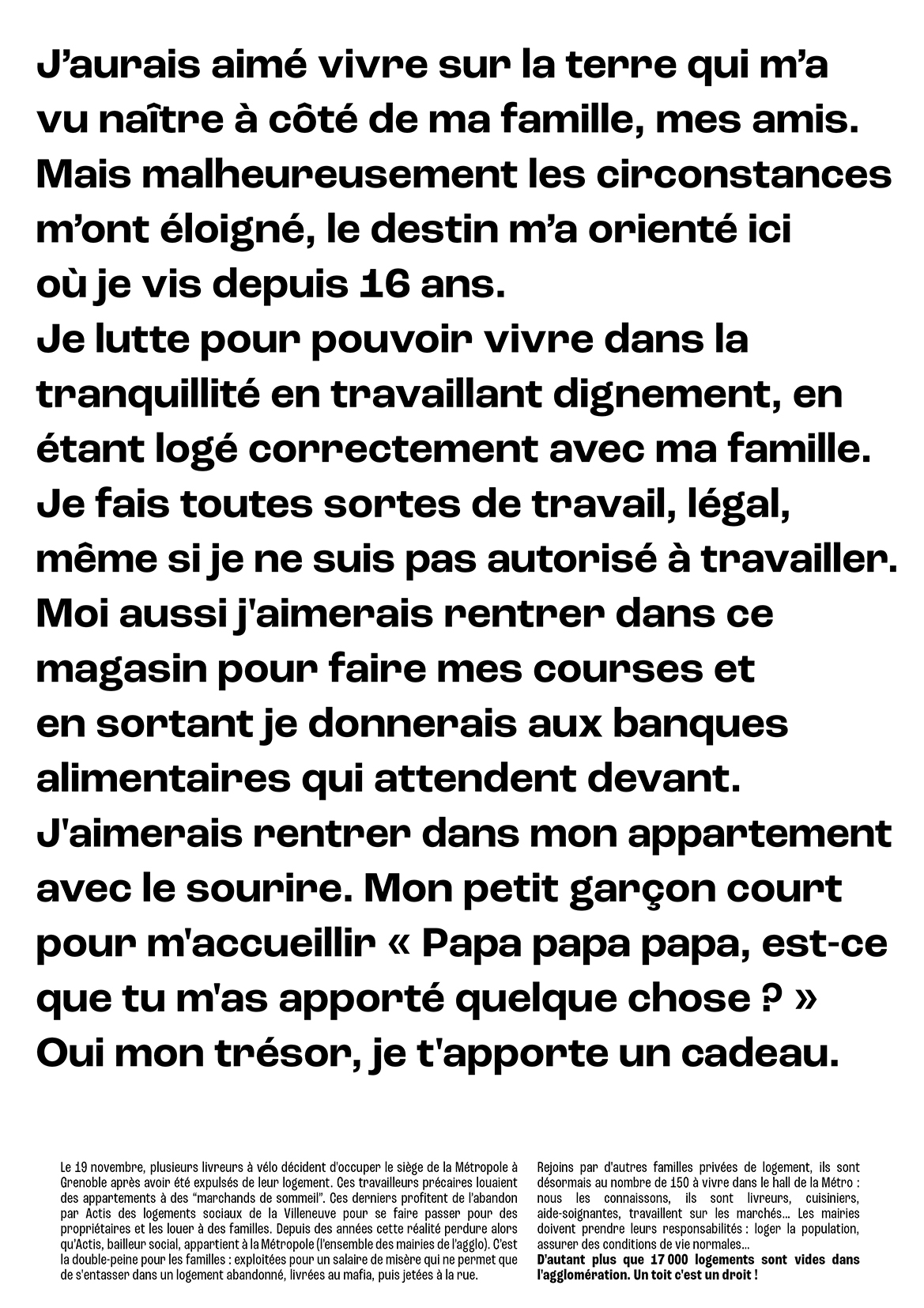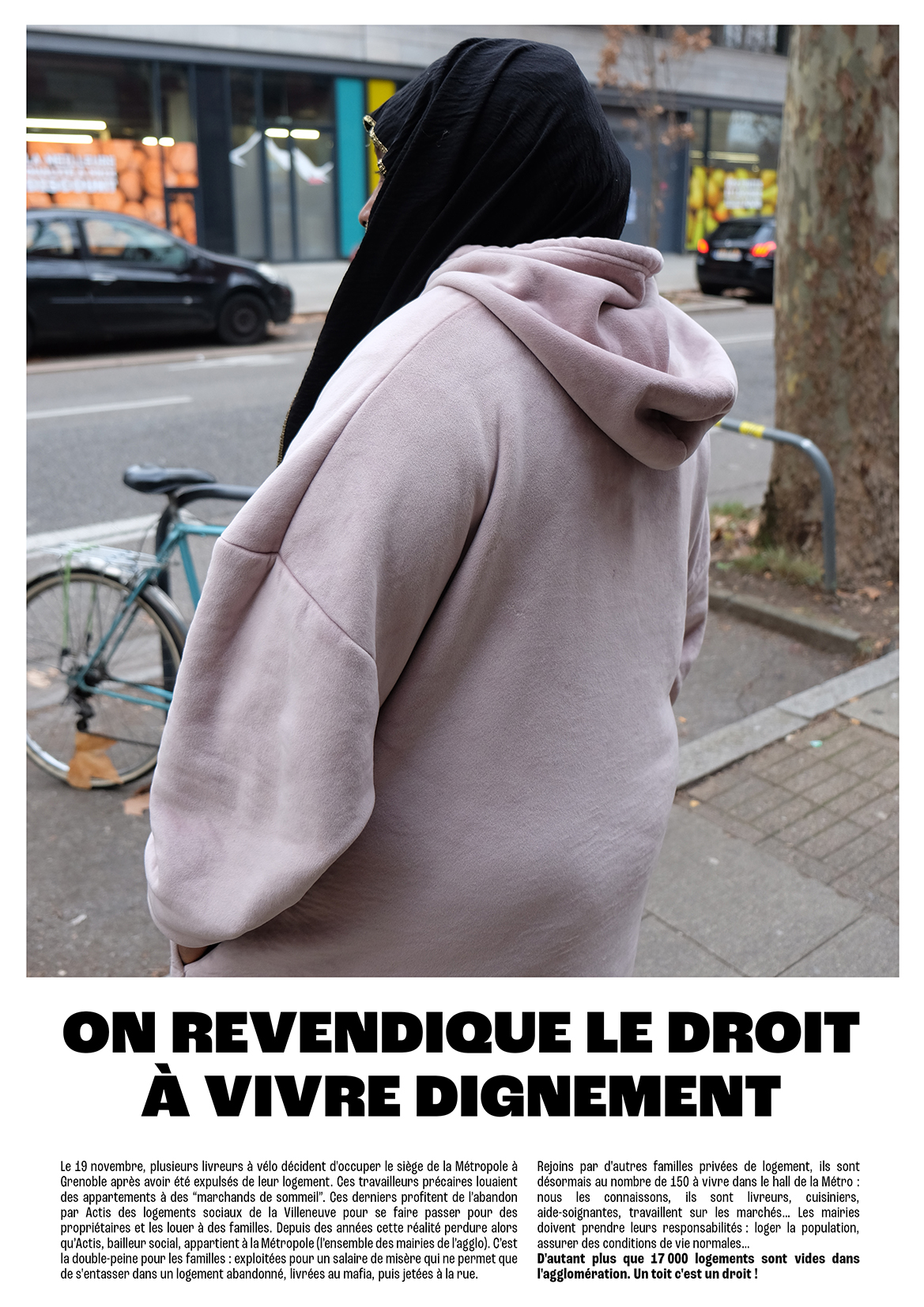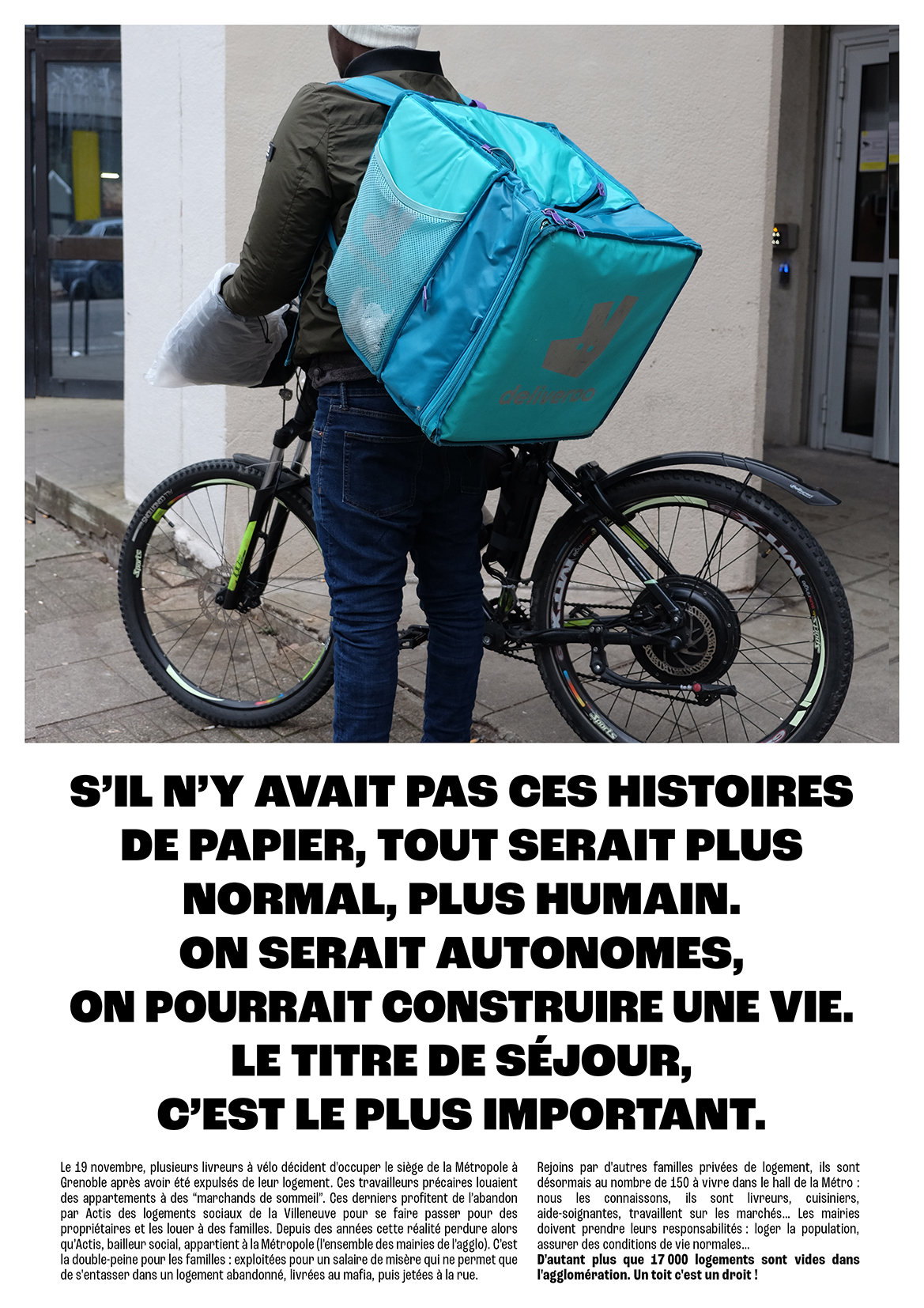 Le 19 novembre, plusieurs livreurs à vélo décident d’occuper le siège de la Métropole à Grenoble après avoir été expulsés de leur logement. Ces travailleurs précaires louaient des appartements à des “marchands de sommeil”. Ces derniers profitent de l’abandon par Actis des logements sociaux de la Villeneuve pour se faire passer pour des propriétaires et les louer à des familles.