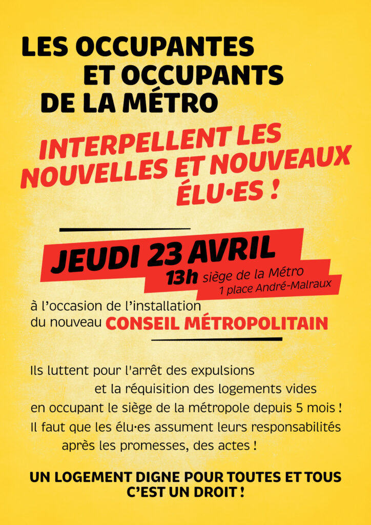 Jeudi 23 avril, 13h : soutenons les occupant-es de la Métro